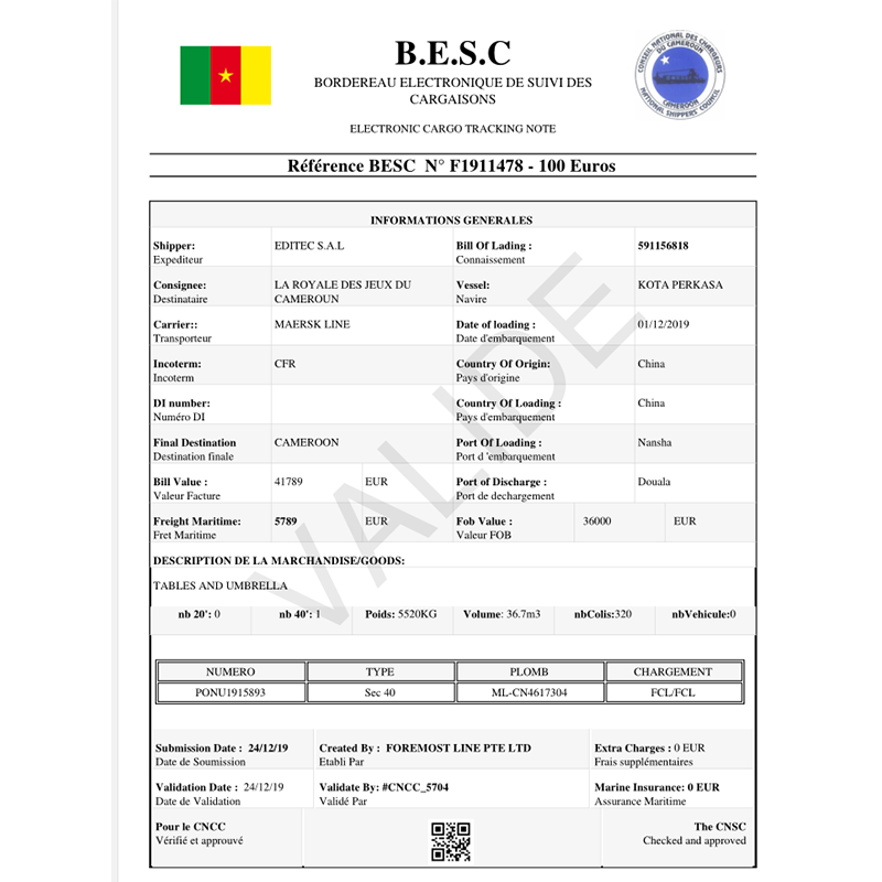Kameroen ECTN, Douala ECTN, Volgens de wet van de staat Kameroen moeten alle goederen die naar de haven van Adura in Kameroen worden verzonden een aanvraag indienen voor de elektronische goederenvolglijst ECTN (BESc).